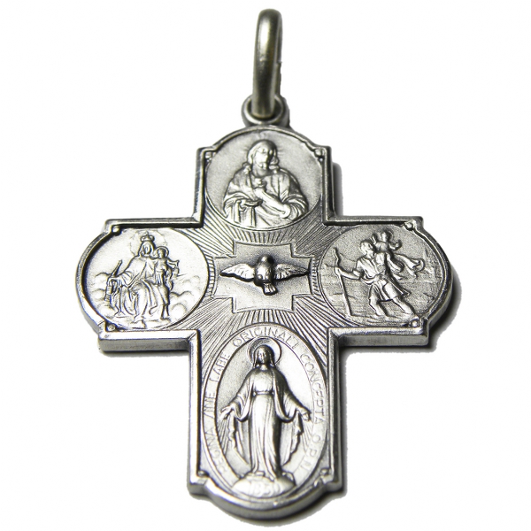 La croce scapolare è un gioiello che racchiude varie incisioni: in alto è rappresentato il Sacro Cuore di Gesù, sul braccio destro San Cristoforo, in basso la Madonna Miracolosa, sul braccio sinistro la Madonna del Carmelo, al centro lo Spirito Santo. Sul retro è presente il retro della Medaglia della Madonna Miracolosa, un’incisione di Piazza San Pietro e la scritta ROMA. E’ un simbolo legato all’ordine dei Carmelitani.