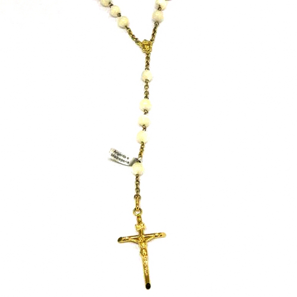 I grani del rosario perla rosa sono in Madreperla. La madreperla viene ricavata dalla parte interna di alcuni molluschi, in particolar modo dalle ostriche. Il rosario è costruito con una crociera, separata dalla croce attraverso una medaglia. Nella medaglia è rappresentata la Madonna. La croce è semplice con bracci a scalpello.